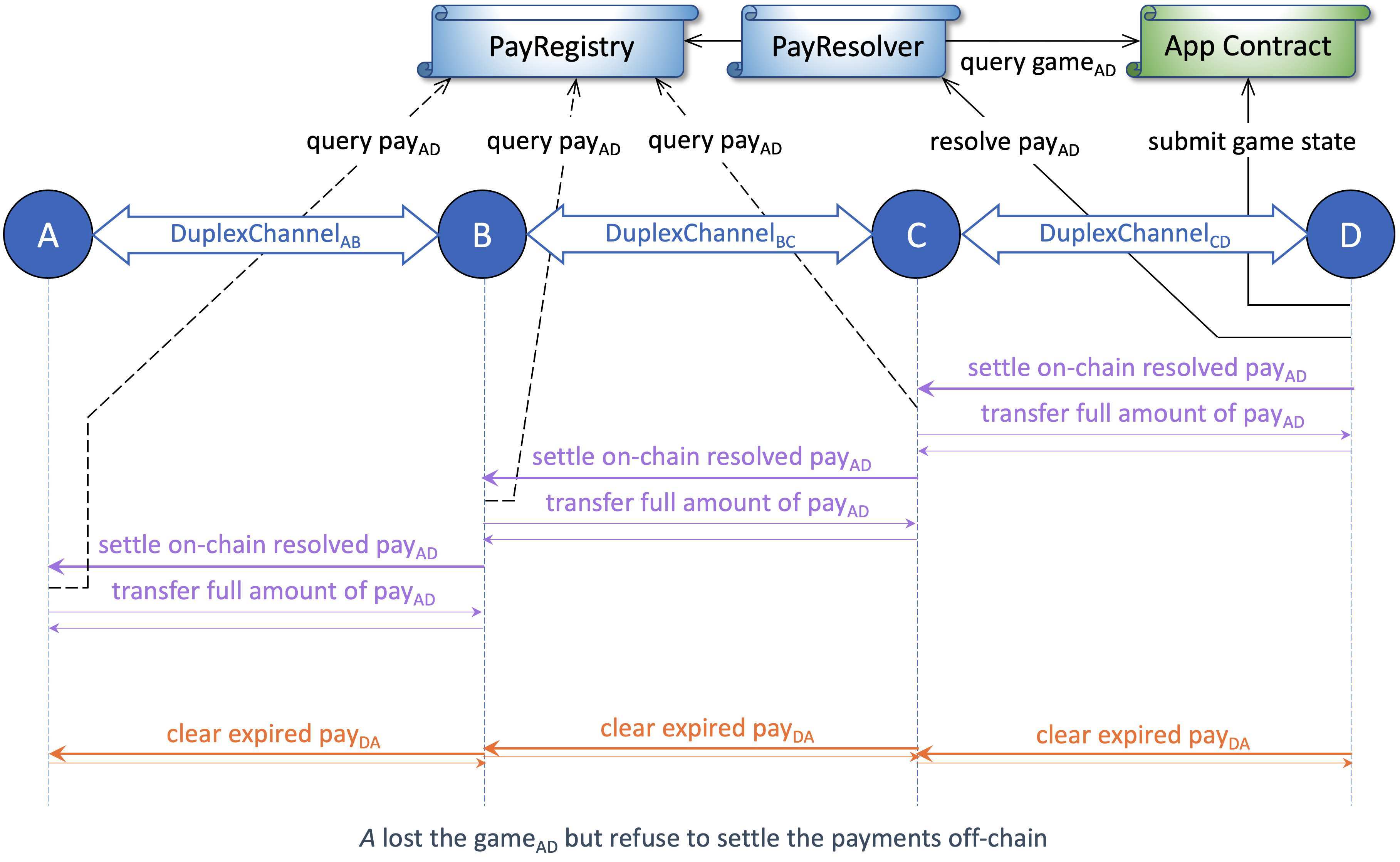 Figure above shows the message flow when A loses the game but refuses to settle the conditional payments off-chain. To claim the prize, the winner D initiates a dispute, resolves the payment on-chain, and completes settlement with its upstream peer. Relay nodes (B and C) never need to perform any on-chain transactions, even when the end players (A and D) fail to cooperate.