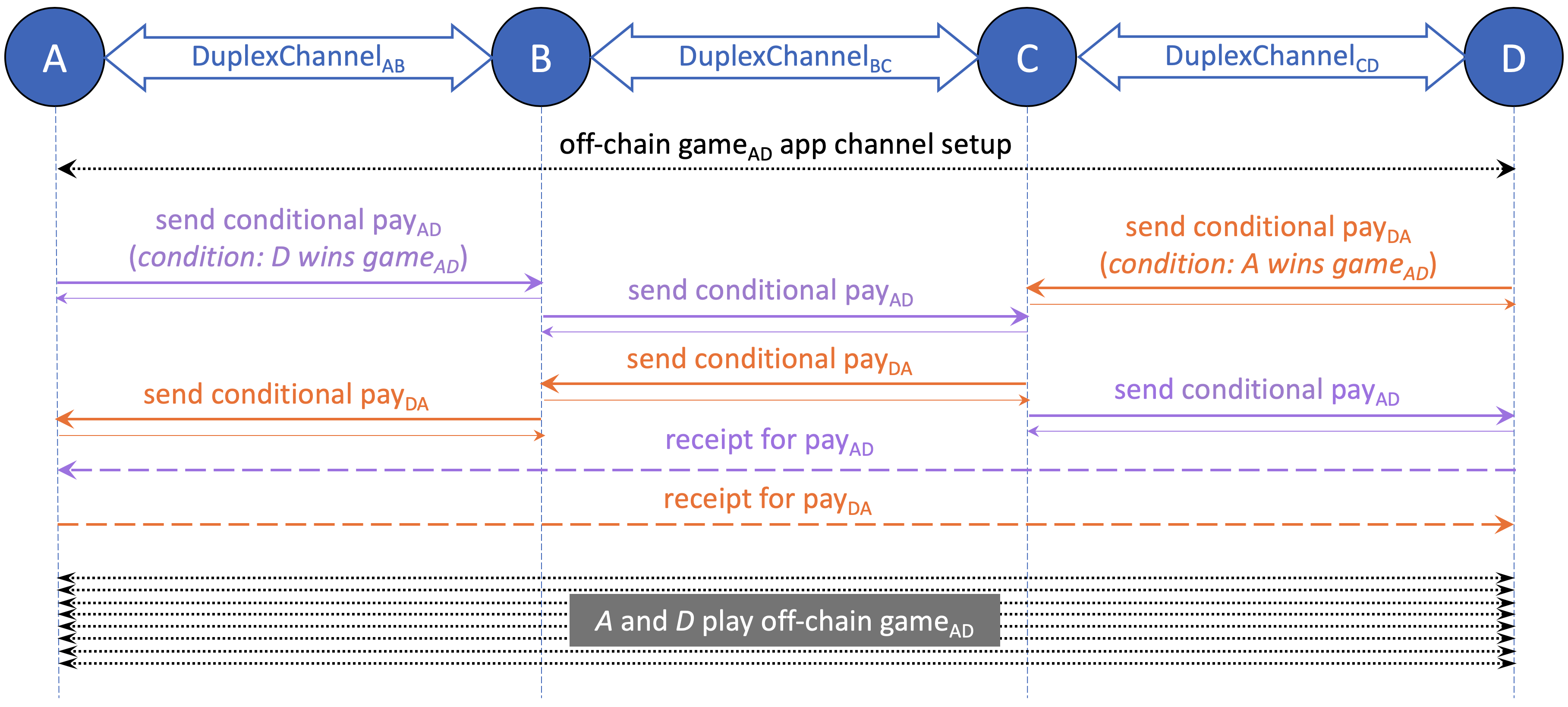 Figure above shows the message flow during the game setup and playing phase. A and D are players of an off-chain game App channel. Black lines represent messages related to game logic, while purple and orange lines represent conditional payment messages from A and D, respectively. Dashed lines indicate direct communication between A and D, without involving relay nodes.