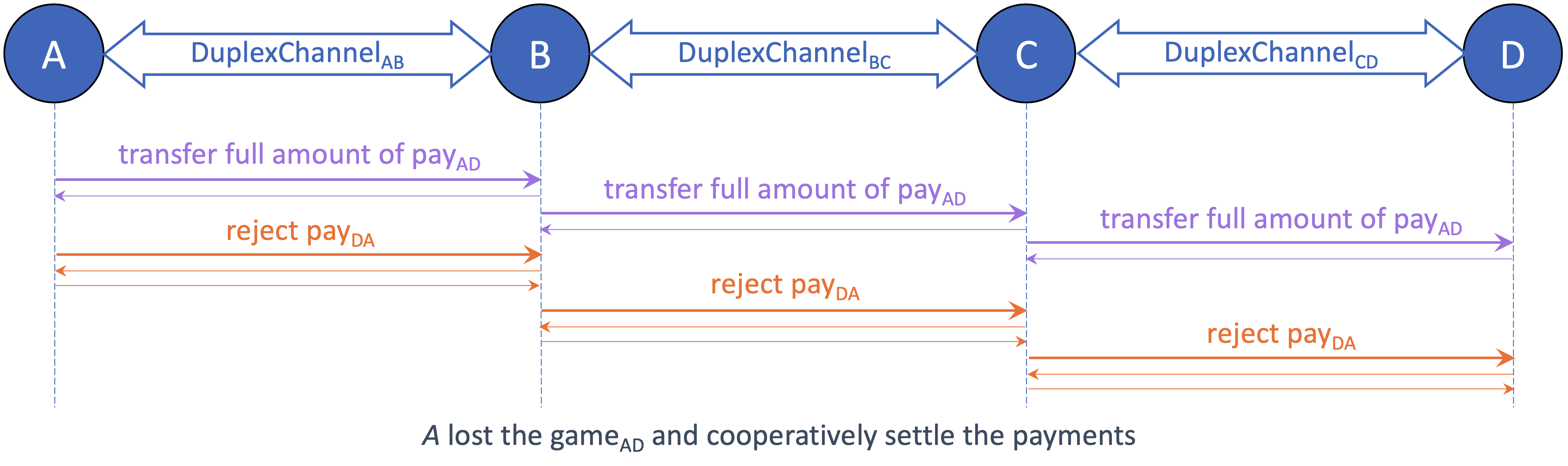 - The conditional payment from the winner D to the loser A is canceled. If A fails to reject the payment, all peers simply wait until it expires and then clear it. D may also resolve it on-chain earlier to accelerate cleanup.