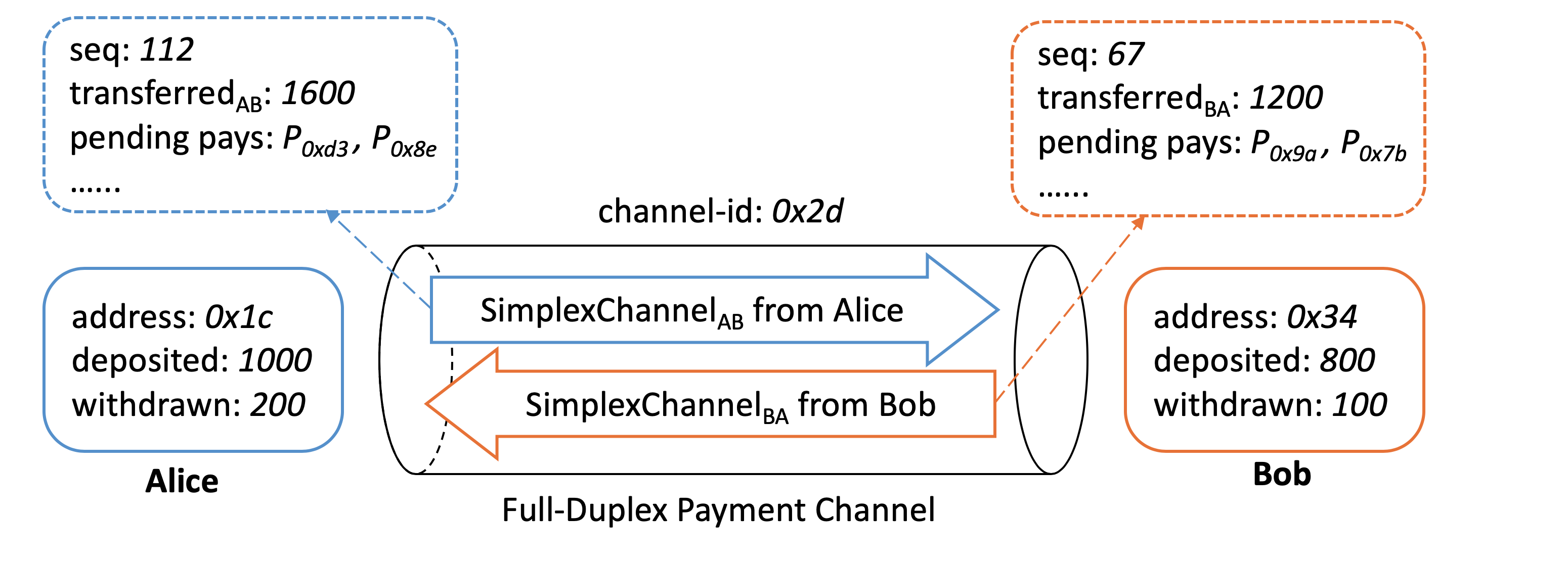 - Off-chain simplex states (dashed boxes) — include the cumulative amounts transferred between peers, pending conditional payments, and monotonically increasing sequence numbers. Peers exchange value off-chain by co-signing updated simplex states; the contracts only verify or settle them when required.